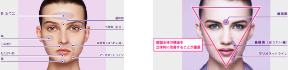 鼻梁、鼻唇沟、眉间皱纹、下巴上的皱纹、坑、宴请眼睛周围的烦恼,可以利用不需开刀手术的透明质酸改善。本院使用在日本首次受到厚生劳动省认可的「Juvedern Vista」。治疗后当天即可化妆洗澡。