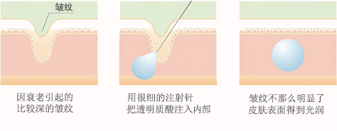 在脸的皮肤表面有的皱纹和沟内注入。根据部位选择适当的透明质酸的种类,量,以及注入方法不同。