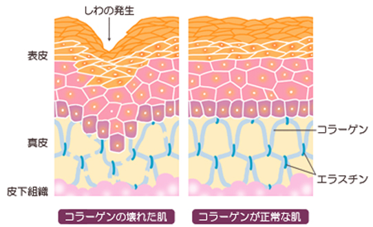 肌肤表现出的弹力,主要是由皮肤真皮层内的胶原蛋白,弹性蛋白,透明质酸构成的。而这些成份又是由真皮层成纤维细胞的构成的。受外界紫外线的影响和年龄的不断增加,成纤维细胞也会逐步退化。成纤维细胞退化后导致新陈代谢停滞,而胶原蛋白等物质的流失,不仅影响了肤质,还直接造成皮肤松弛,皱纹的产生。